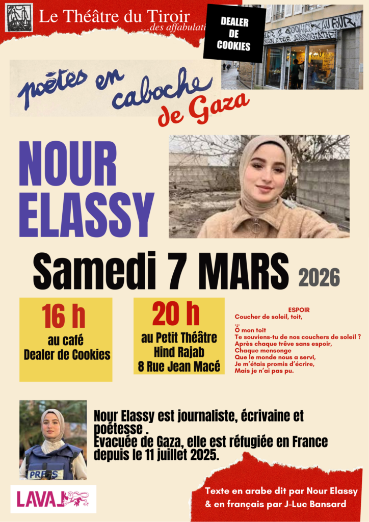 Sam. 7-16hNour Elassy, poétesse de Gaza Hors nos murs : au Salon de Thé : DEALER DE COOKIES, rue des chevaux Vieux Laval