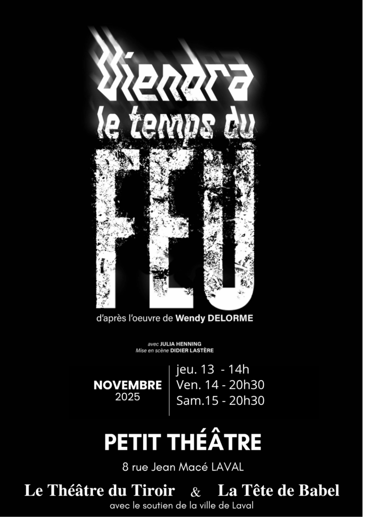 Jeu 13 nov.(Réserver ici) 14h Ven 14 nov.(Réserver ici)20h30 Sam 15 nov.(Réserver ici)20h30 . VIENDRA LE TEMPS DU FEU… Théâtre .